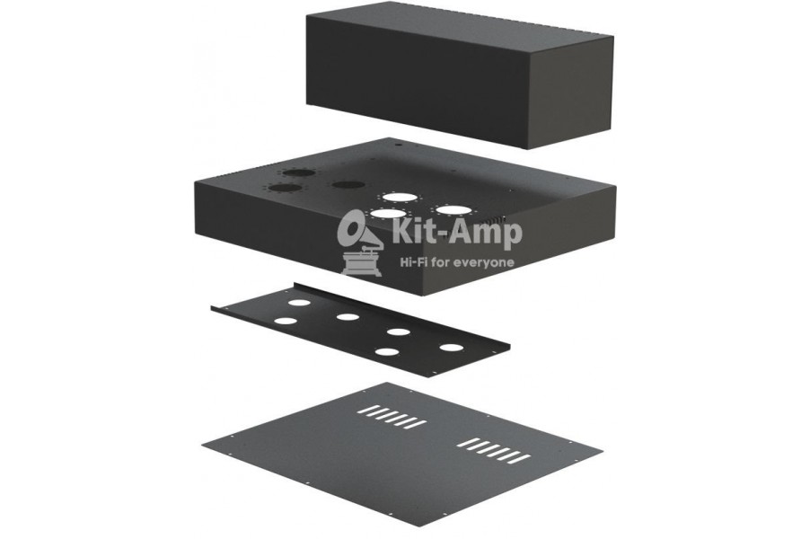 Корпус двухтактный ламповый усилитель на 6П41С и 6Н2П состоит из 4-х частей. Колпак под трансформатор, шасси лампового усилителя, монтажная съемная панель, дно корпуса лампового усилителя.
